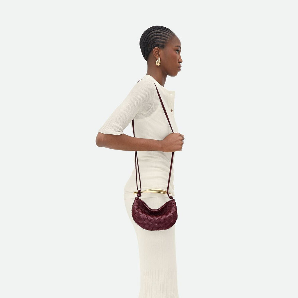 Introducing the Bottega Baby Sardine Cross Body Bag. Expertly crafted in Intrecciato leather, this bag features a unique sculptural metallic top handle for a touch of modern elegance. Keep your essentials close at hand while making a statement with this versatile and stylish accessory