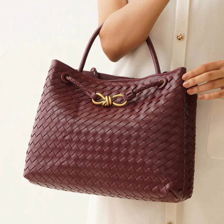 Crafted from the brand’s signature Intrecciato-woven leather in a rich Barolo burgundy hue, this compact silhouette is finished with a sculptural knotted leather strap, symbolizing movement and fluidity — the essence of the Andiamo name ("let’s go" in Italian).