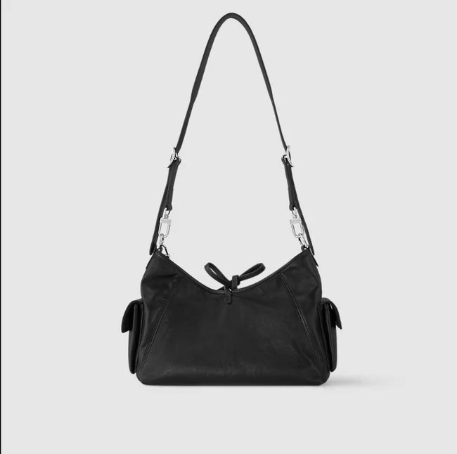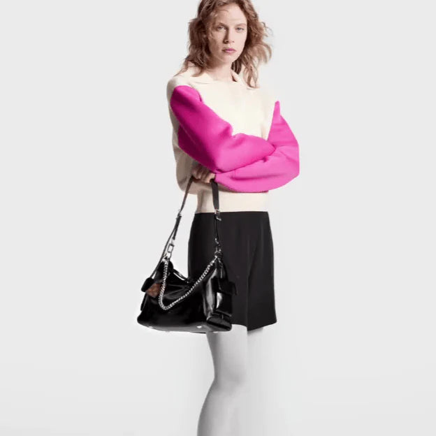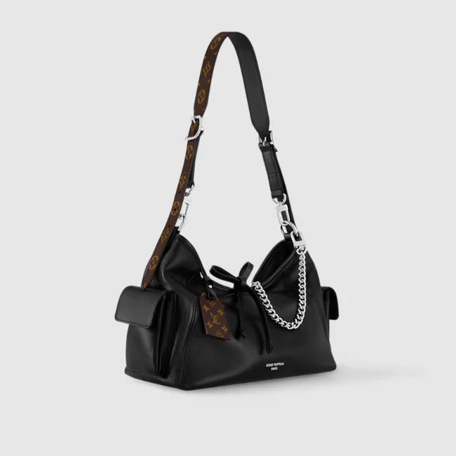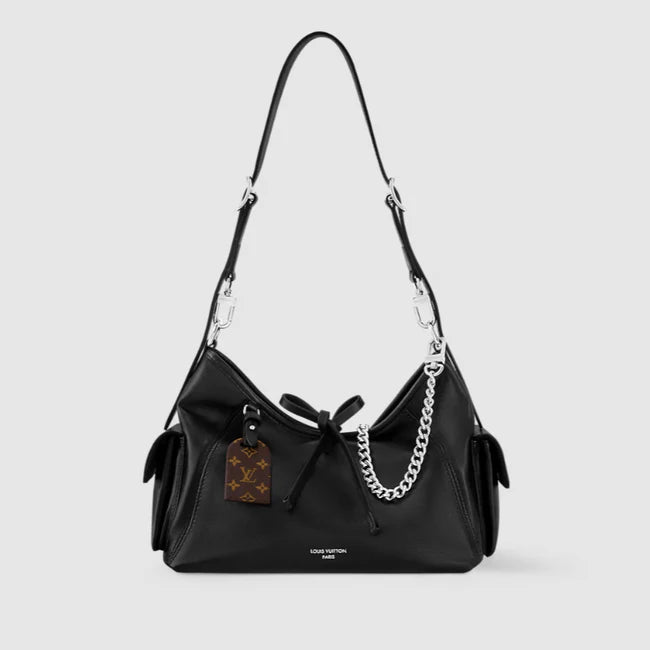 With its dark allure and slouchy silhouette, the CarryAll Cargo PM handbag is crafted from ultra-soft lambskin with a cool, slightly “rumpled” aspect and is accented with polished palladium-finish hardware. This day-to-evening piece offers great styling potential, thanks to a removable strap and a chic, detachable chain.