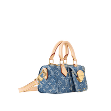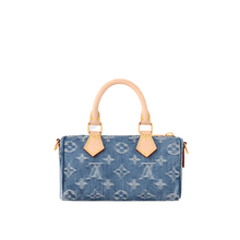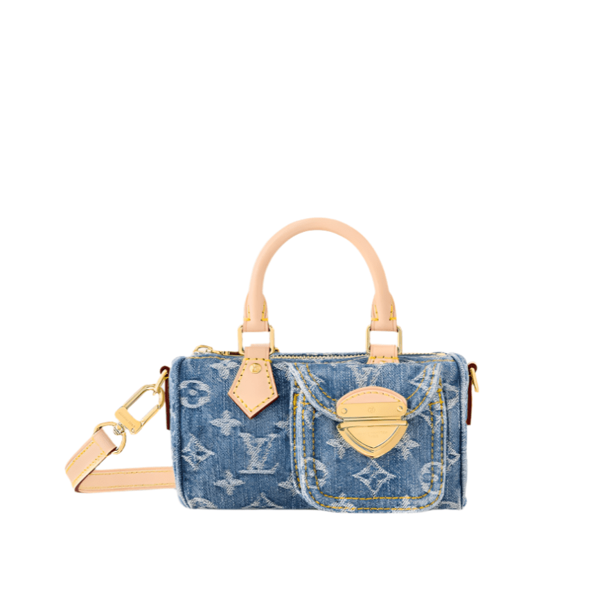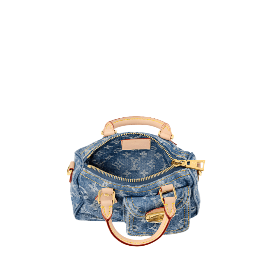 The adorable Speedy Nano handbag is even cuter in stone-washed Monogram Denim with natural leather handles and removable shoulder strap. The denim canvas is made from certified-organic cotton. On the side of the bag is a small pocket that opens and closes with a distinctive tuck lock. The Nano fits a smartphone, compact wallet, and lipstick.