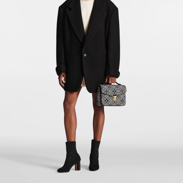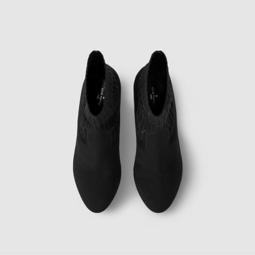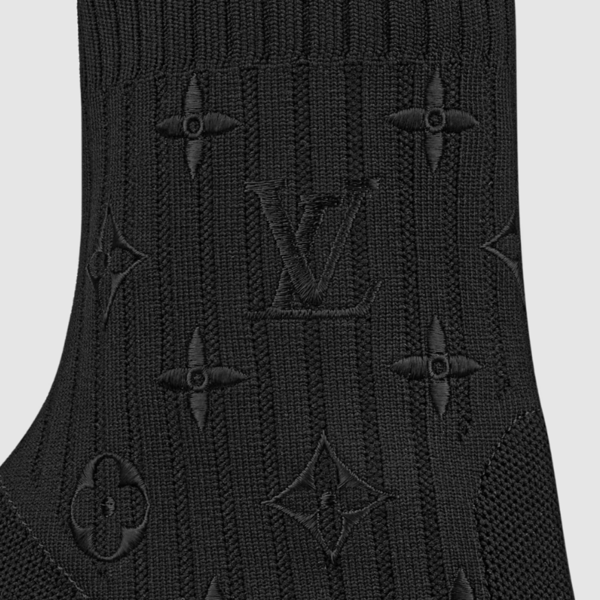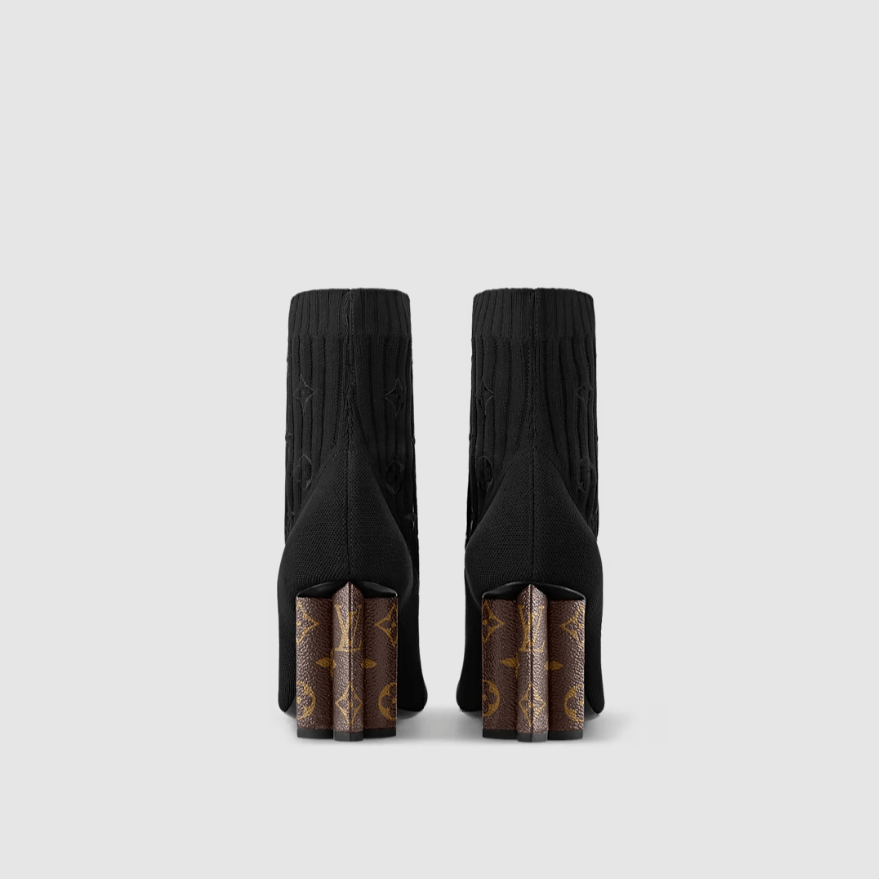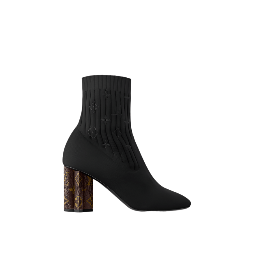 One of Louis Vuitton's most emblematic styles, the Silhouette Ankle Boots are revisited in black stretch textile, which provides a second-skin fit. The signature of the Silhouette line is its heel, which is shaped like a Monogram Flower and covered in patent Monogram canvas. This model features a padded insock for enhanced comfort.