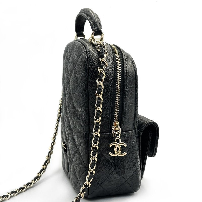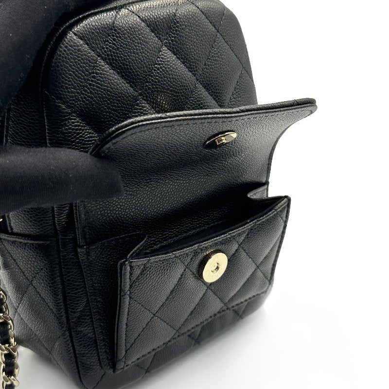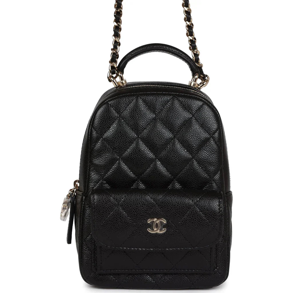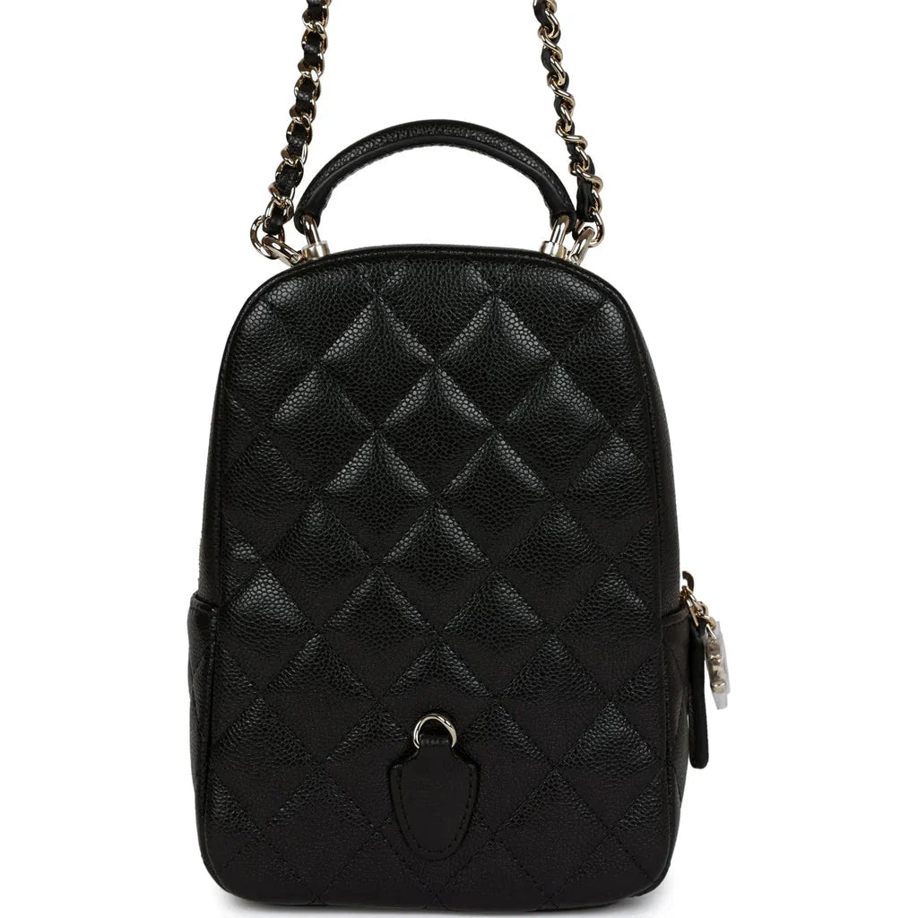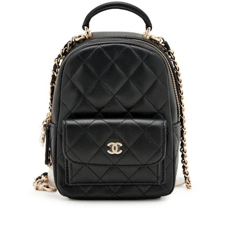 Introducing the Chanel Quilted Backpack, crafted with sleek and durable caviar leather and accented with light gold hardware for a touch of luxury. Its quilted design adds a stylish element while providing maximum comfort and functionality. Elevate your everyday look with this timeless and versatile backpack.