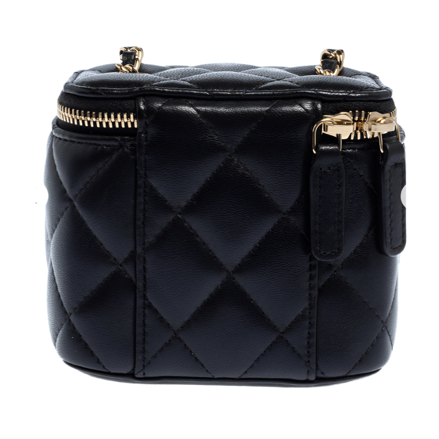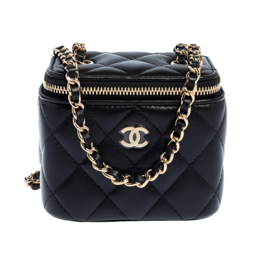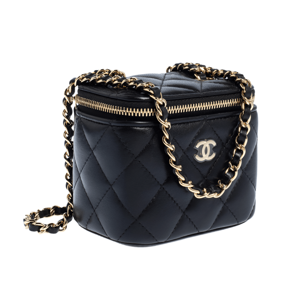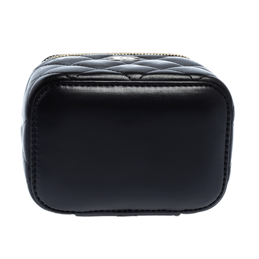 This micro-sized Chanel Vanity Case is made from soft black and features a discreet "CC" logo. The gold-toned zipper reveals its compact inside, with space for an evening’s essentials only - your credit cards and lipstick. Wear this Chanel Vanity Case crossbody or over your shoulder, or hold it in your hand by the top handle. Thebag comes in unworn condition with no signs of usage.