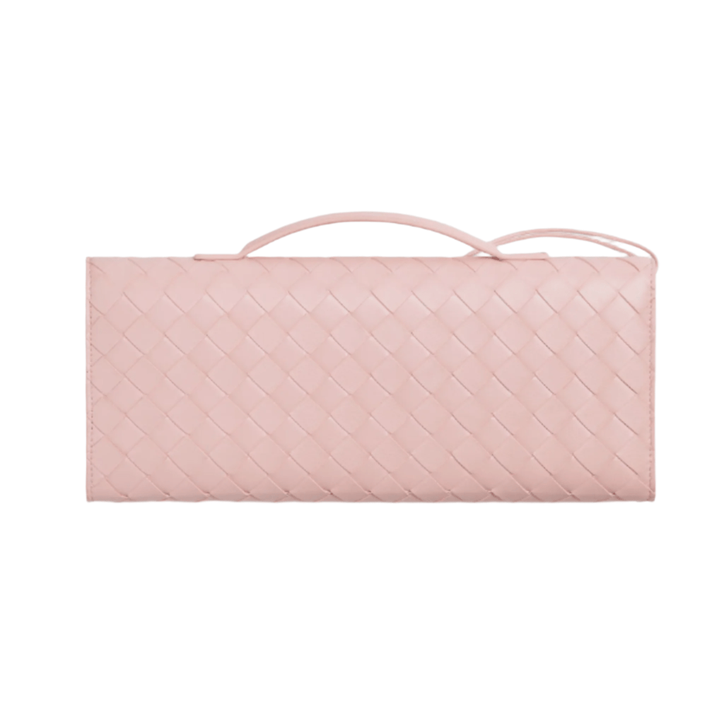 Its clean silhouette and subtle branding reflect Bottega Veneta’s philosophy of quiet luxury, while the delicate rose hue adds a graceful touch to any ensemble.