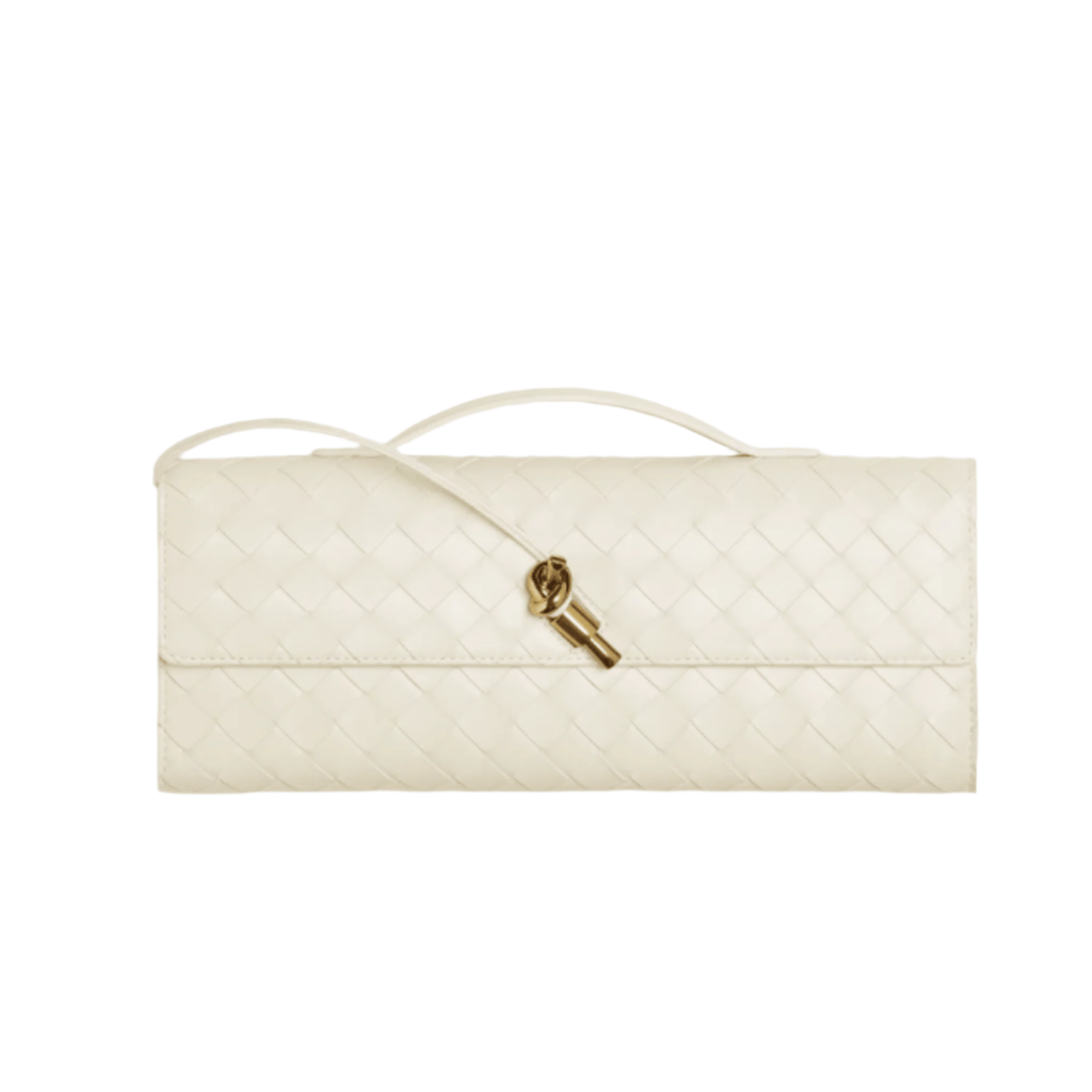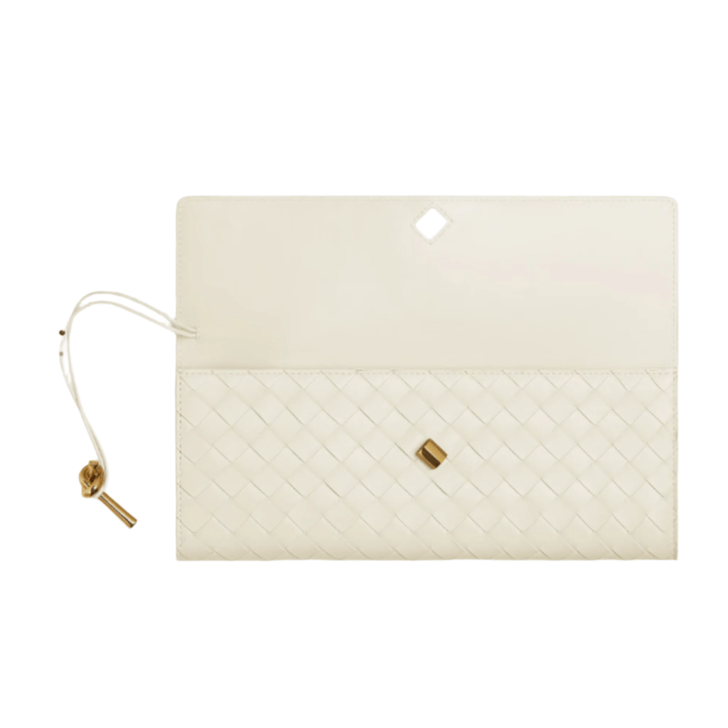 Featuring a sleek silhouette with a knotted brass detail that nods to Bottega’s heritage of artisanal craftsmanship, the Andiamo Clutch is designed to move with you — from day to evening, from understated elegance to bold refinement.