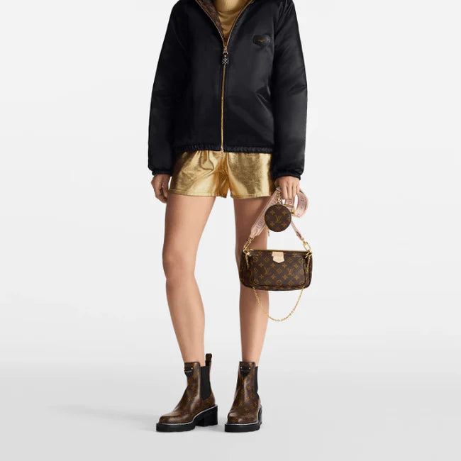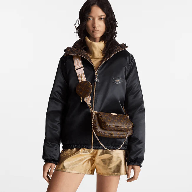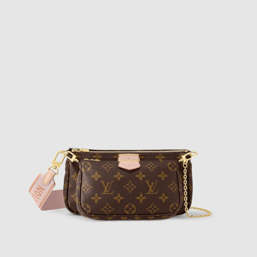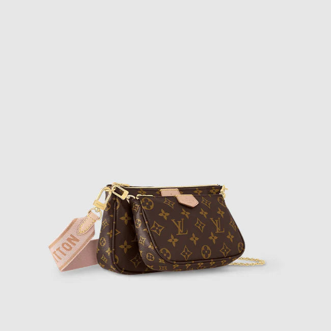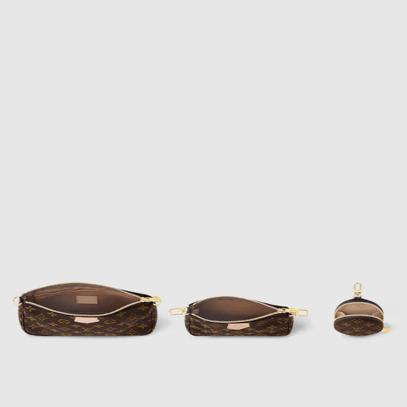The Multi Pochette Accessoires is a hybrid cross-body bag with multiple pockets and compartments that brings together a Pochette Accessoires, a Mini Pochette Accessoires and a Round Coin Purse. Fashioned from Monogram canvas with a mini Monogram pattern on the sides of the two pochettes, it has both a removable gold-tone chain and an adjustable Louis Vuitton inscribed Jacquard strap for multiple carrying options