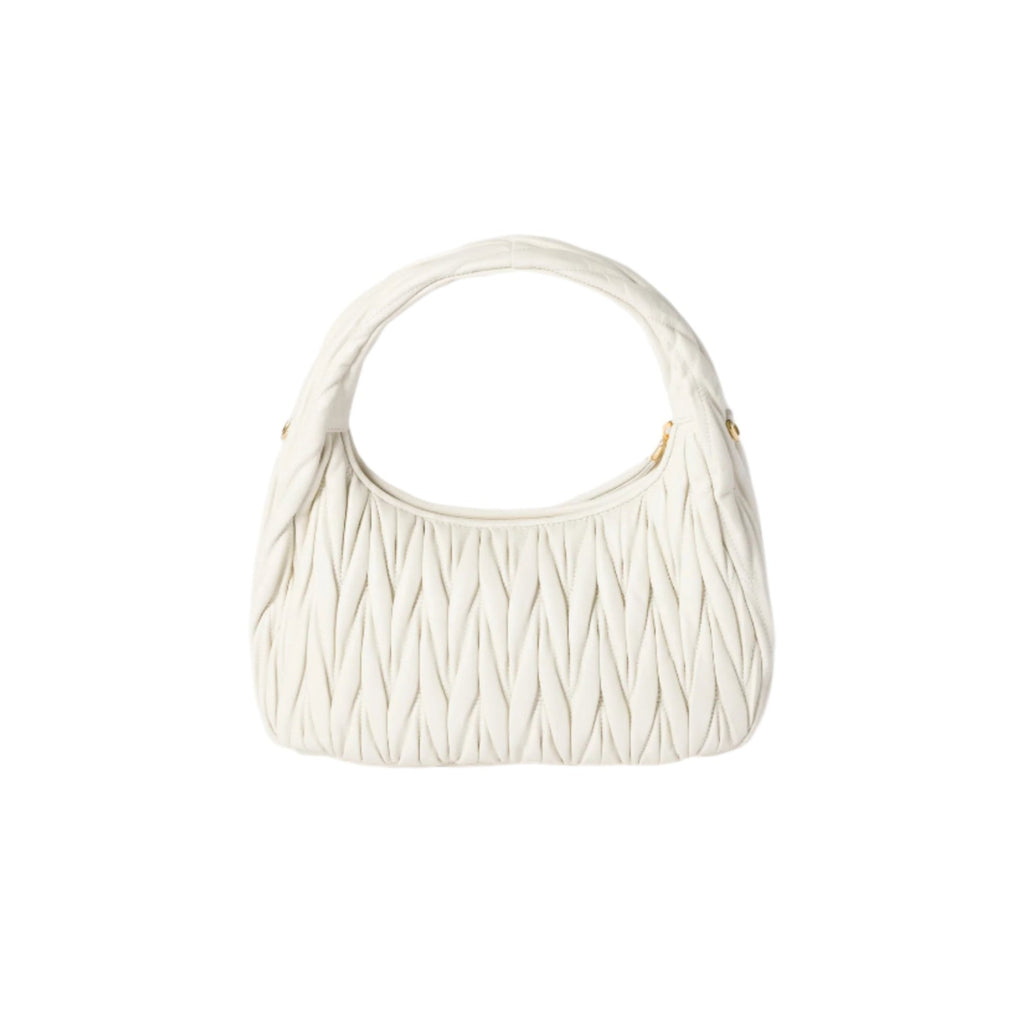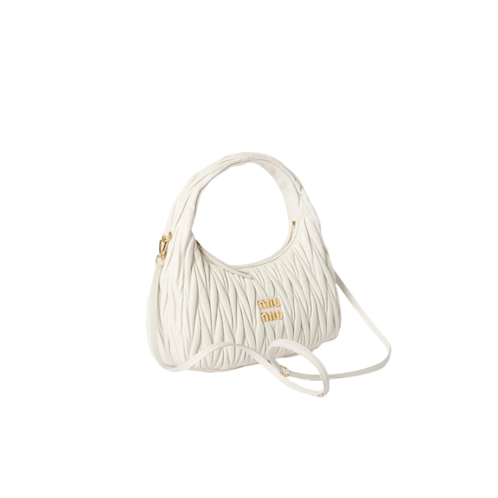 This Miu Miu Small Miu Wander Off White Matelassé Bag offers a sleek and versatile accessory for any outfit. With its signature matelassé design and off-white color, this bag exudes sophistication and elegance. Perfect for the fashion-forward and practical individual, it pairs style with functionality