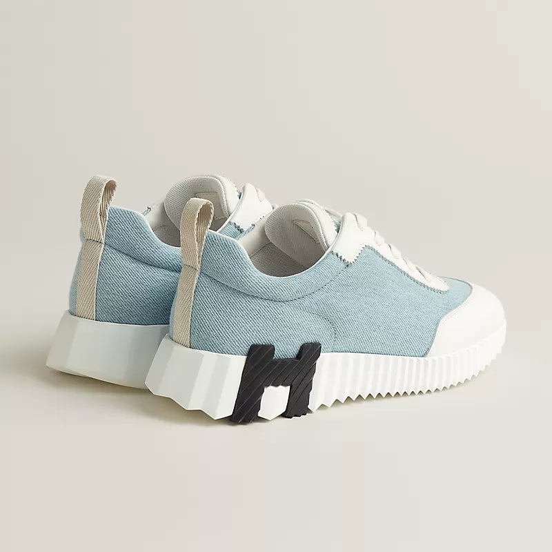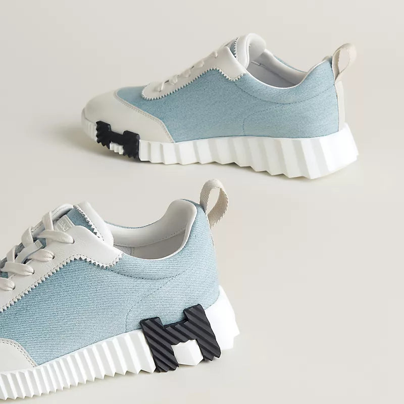 The Bouncing sneaker features a durable white rubber sole complemented by beige and fuchsia pink rubber inserts at the front and back, respectively, enhancing both style and traction. Inside, a pebble beige lambskin insole and lining provide exceptional comfort and breathability, while the beige fabric ribbon adds a refined detail. This design combines expert craftsmanship with functional elegance for a versatile everyday shoe.