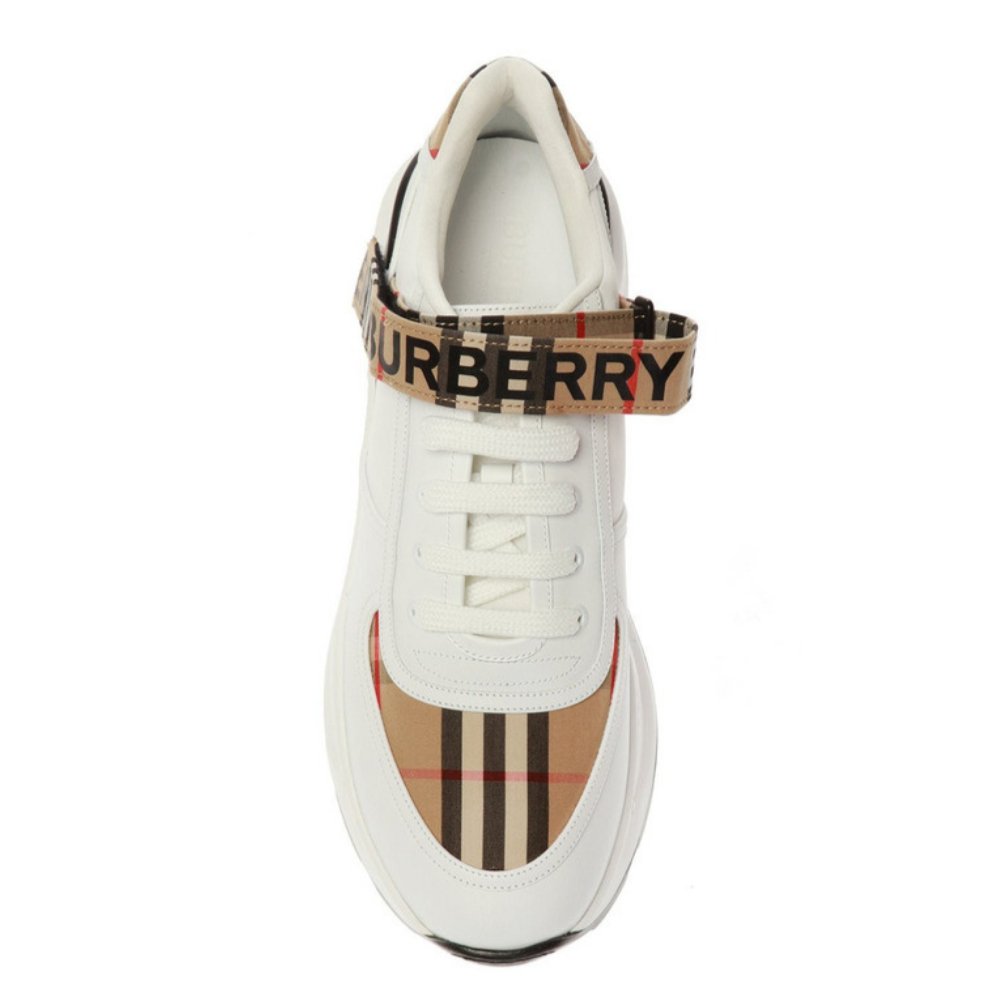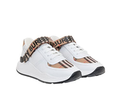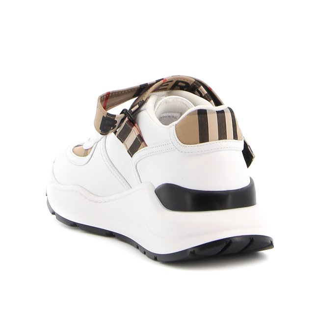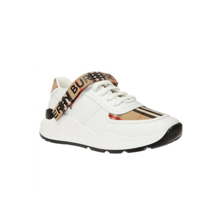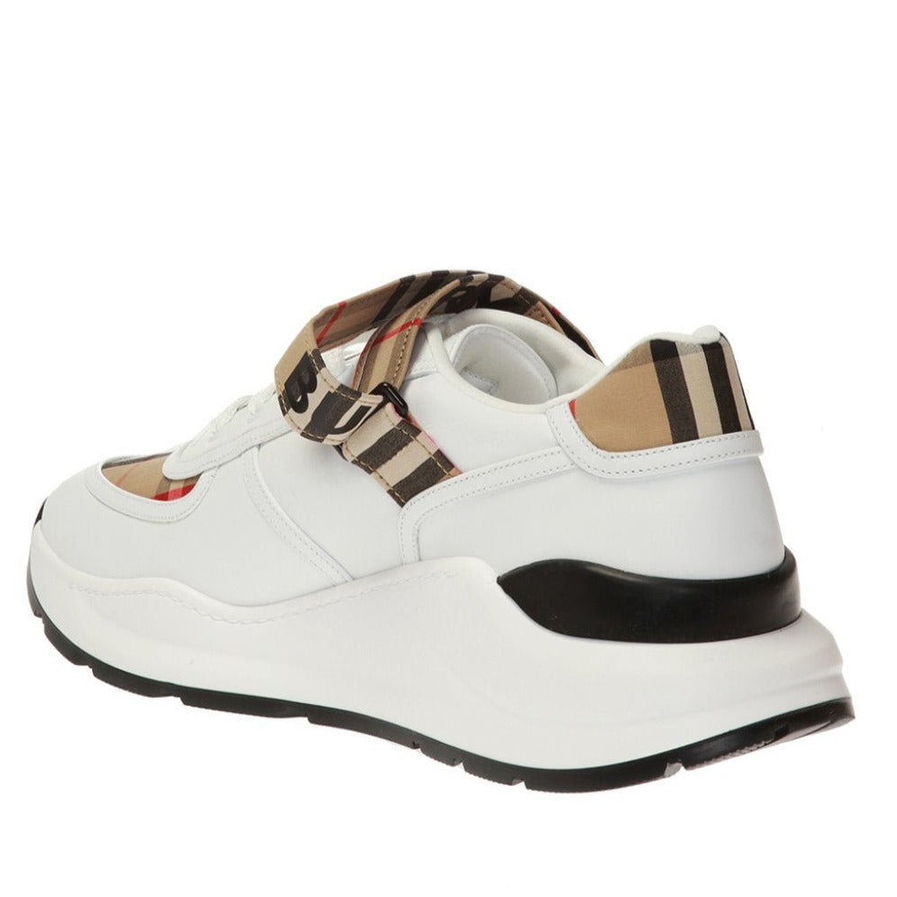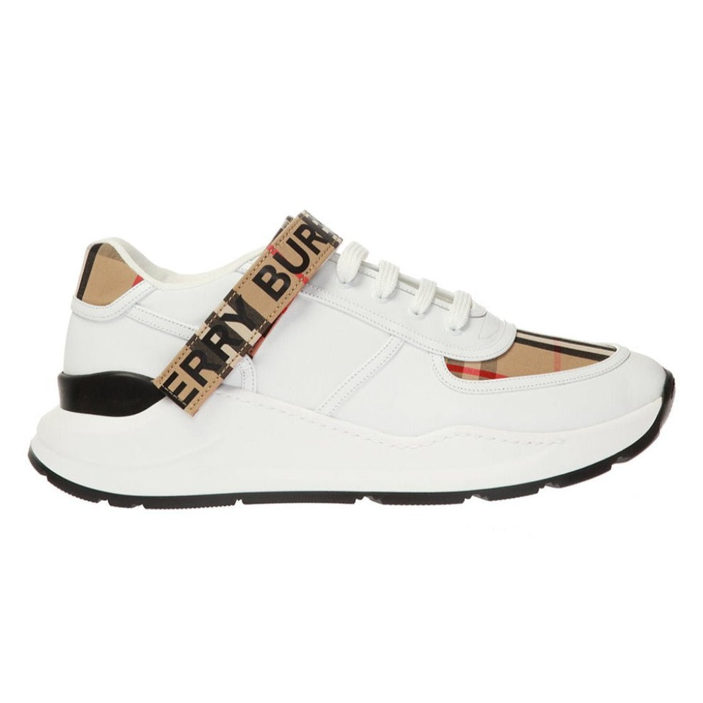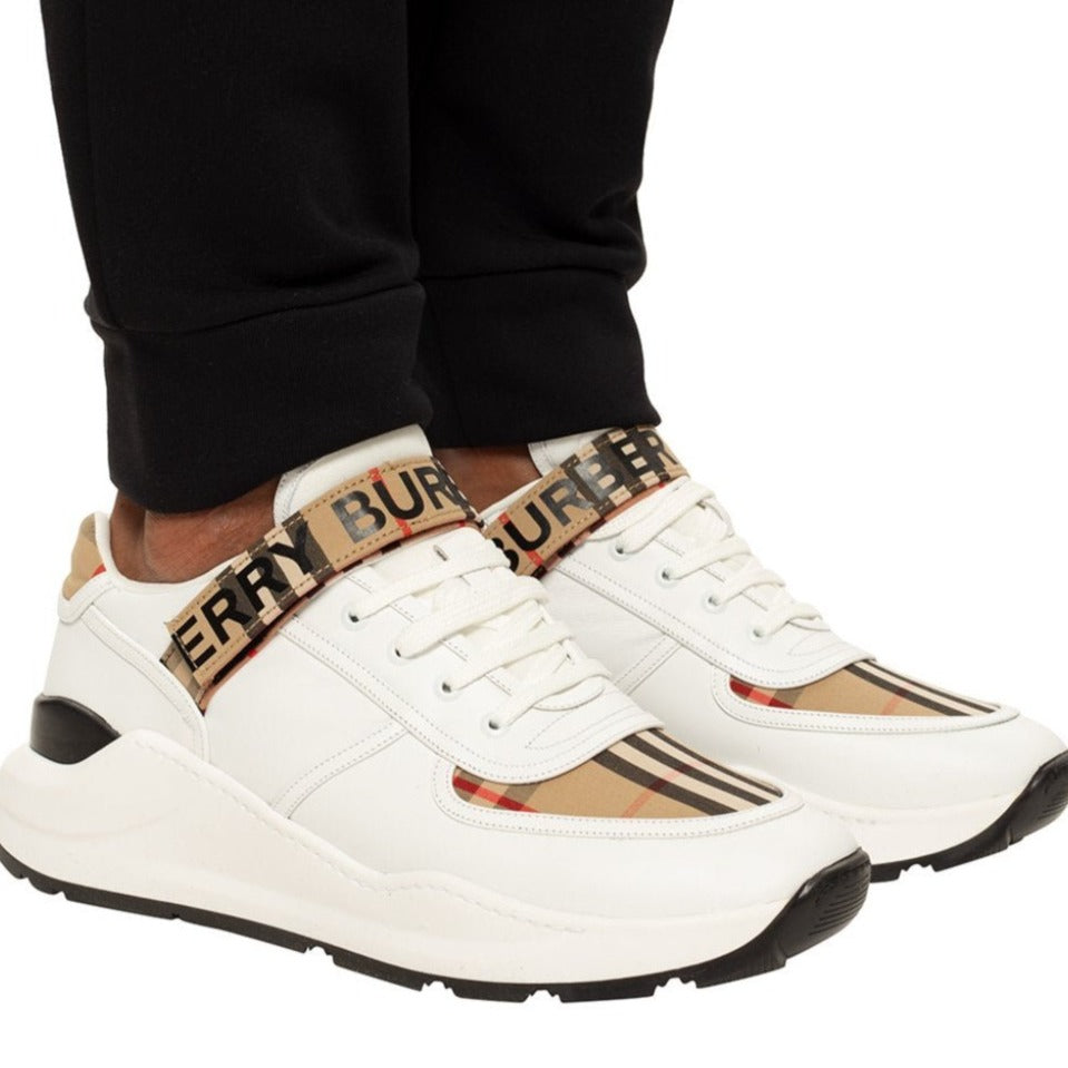 White lace-up sneakers from Burberry. Made of leather. Decorated with the brand’s signature colorful check. Black logo print on the front. Black and white rubber sole Introducing the Burberry Ronnie Low Check Sneaker in 'Beige.' Made with high-quality materials and the iconic Burberry check pattern, these sneakers are a timeless addition to any wardrobe. With their low-top design and comfortable fit, these sneakers offer both style and practicality. Elevate your footwear game with Burberry.