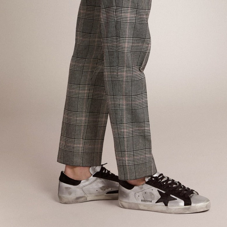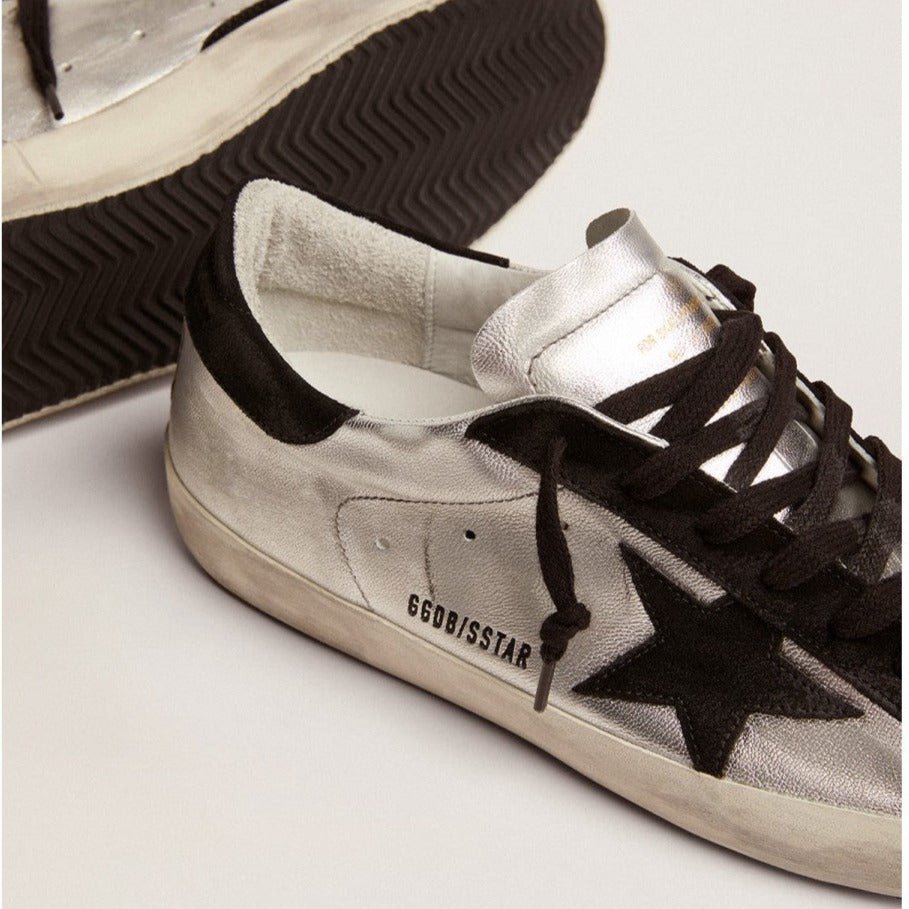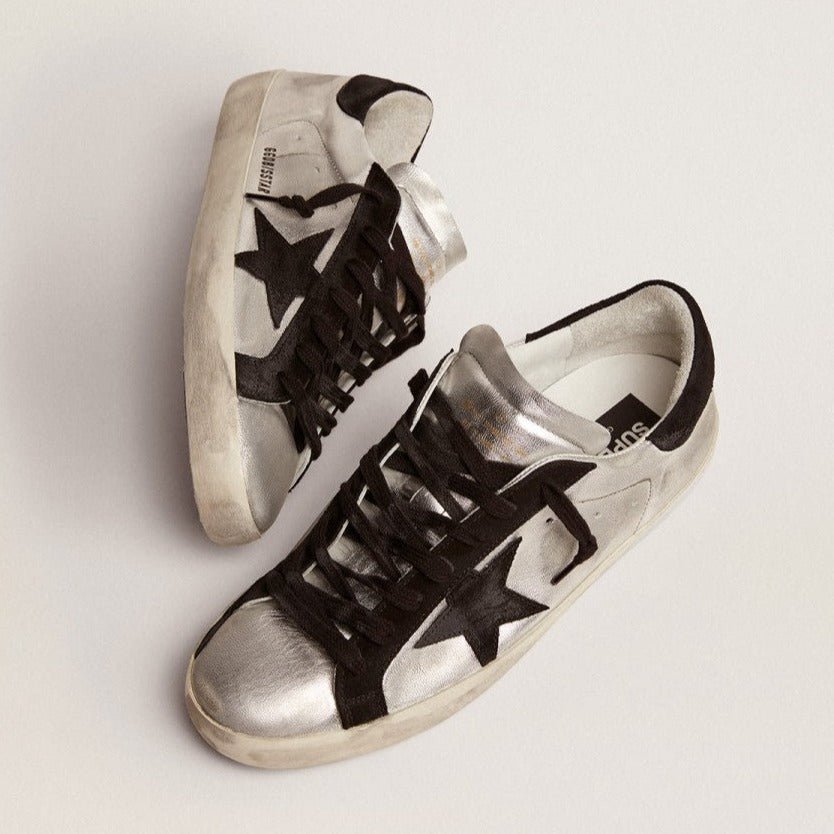 "The Golden Goose Super-Star Sneakers are perfect for adding a touch of luxury to your everyday style. Crafted with high-quality silver leather and contrasting inserts, these sneakers provide both comfort and style. Complete your look with these versatile and trendy shoes."