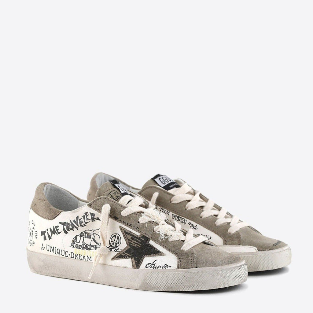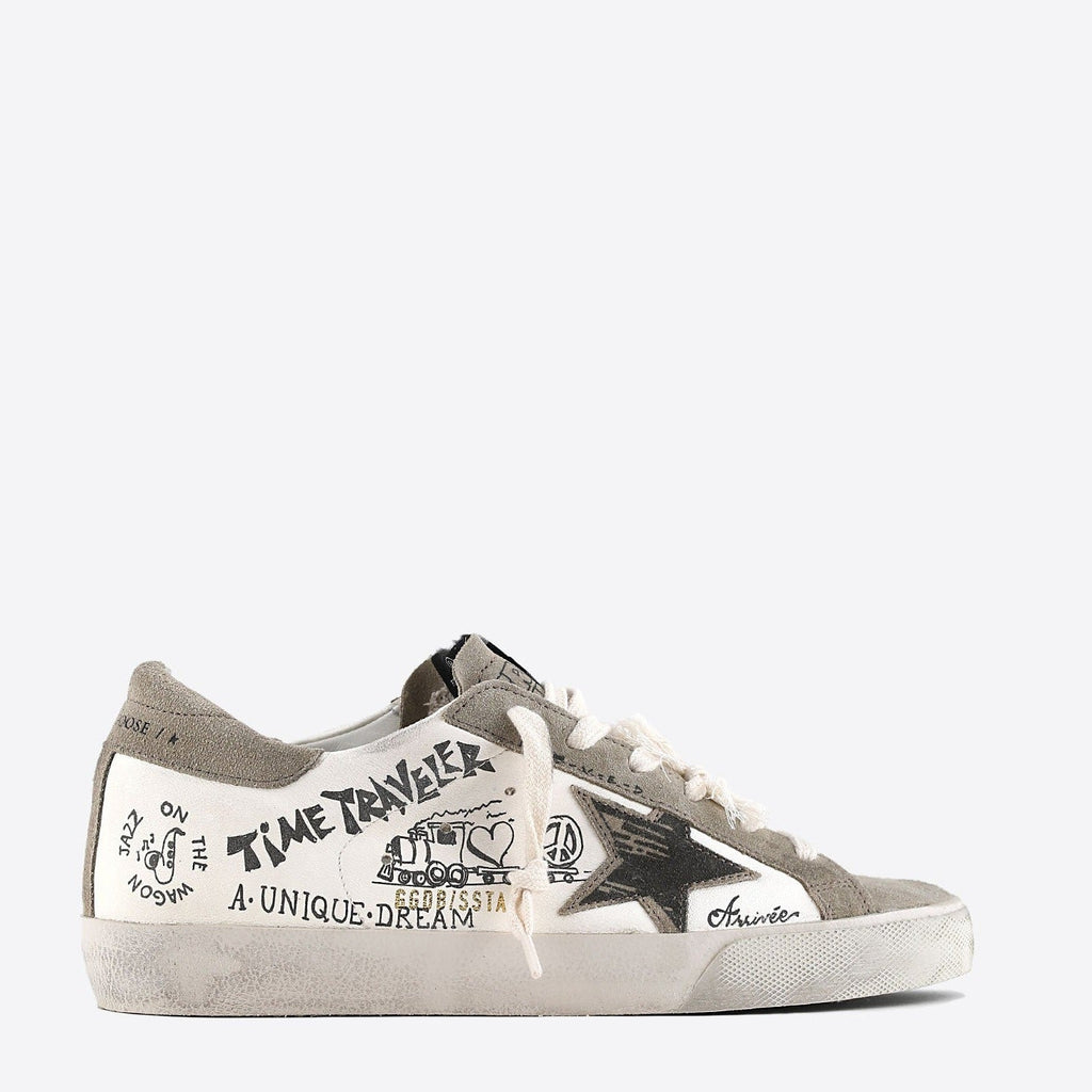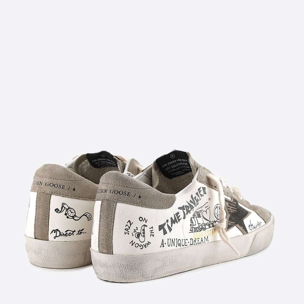 Sneakers golden goose in white leather, round tip, lace-up, logo patch on the tongue, suede inserts, i am deliberately consumed, all-over black contrasting graphic prints, stella logo on the side, ggdbstar platinum lettering on the side, black contrasting golden goose logo on the back patch, rubber sole.