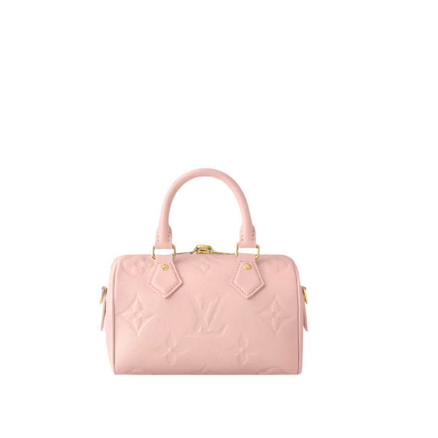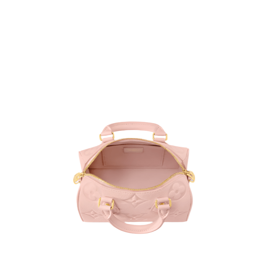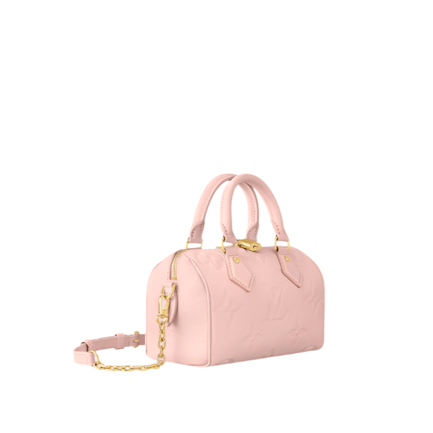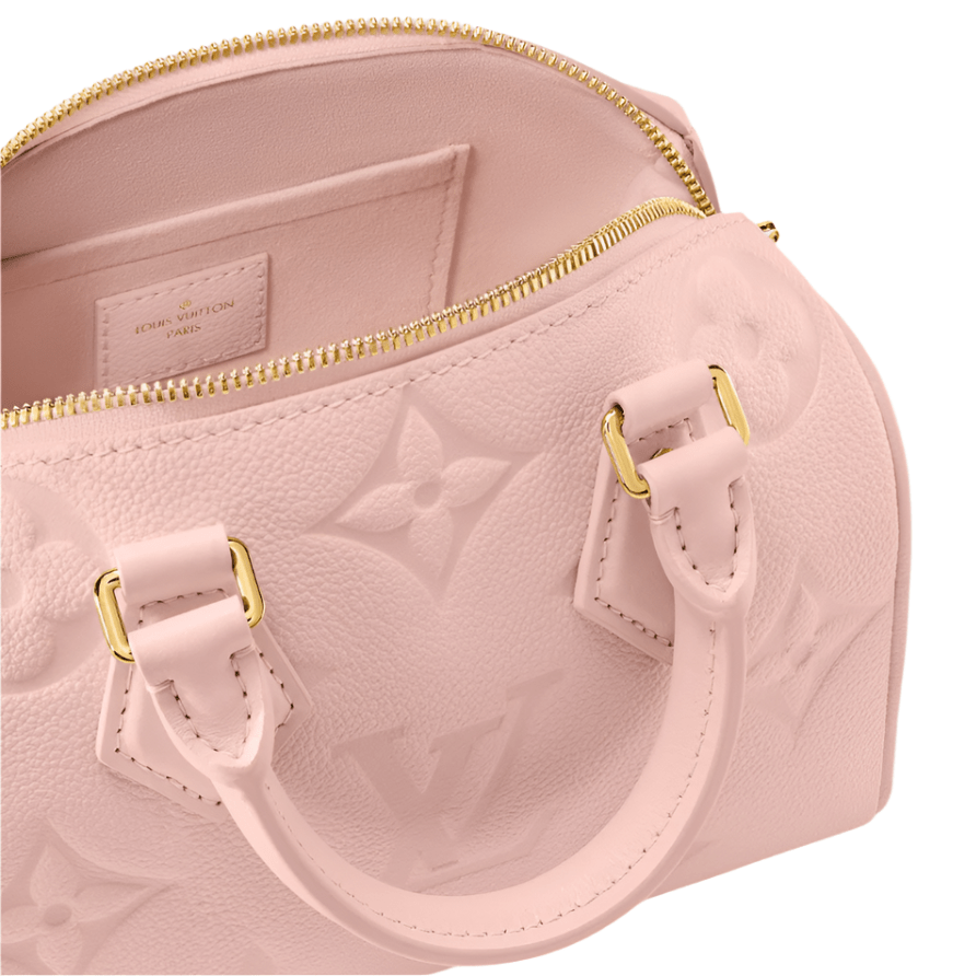 Crafted from Monogram Empreinte leather in a soft pastel shade, this version of the Speedy 20 Bandoulière takes its unique shape from the House’s Speedy travel bag from the 1930s. An adjustable and removable chain allows the bag to be worn over the shoulder, while two top handles allow it to be carried by hand.