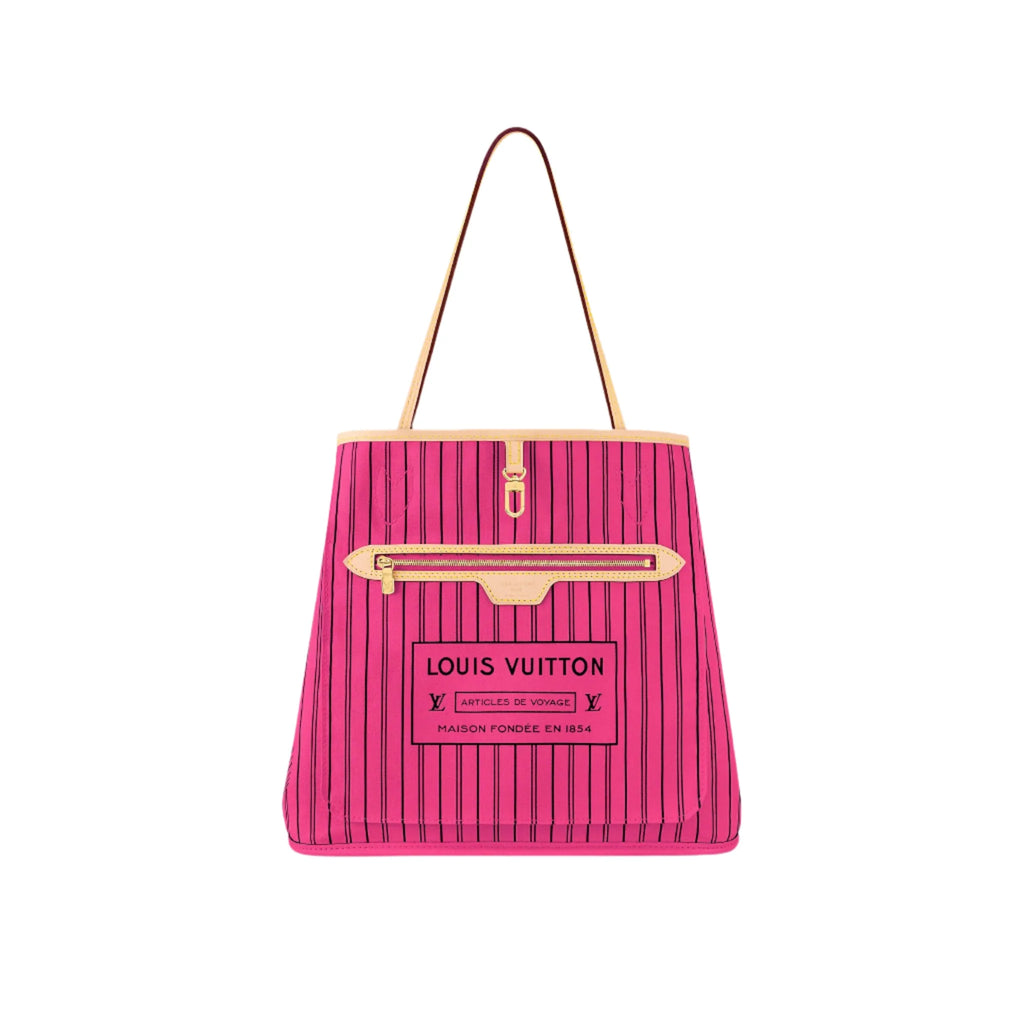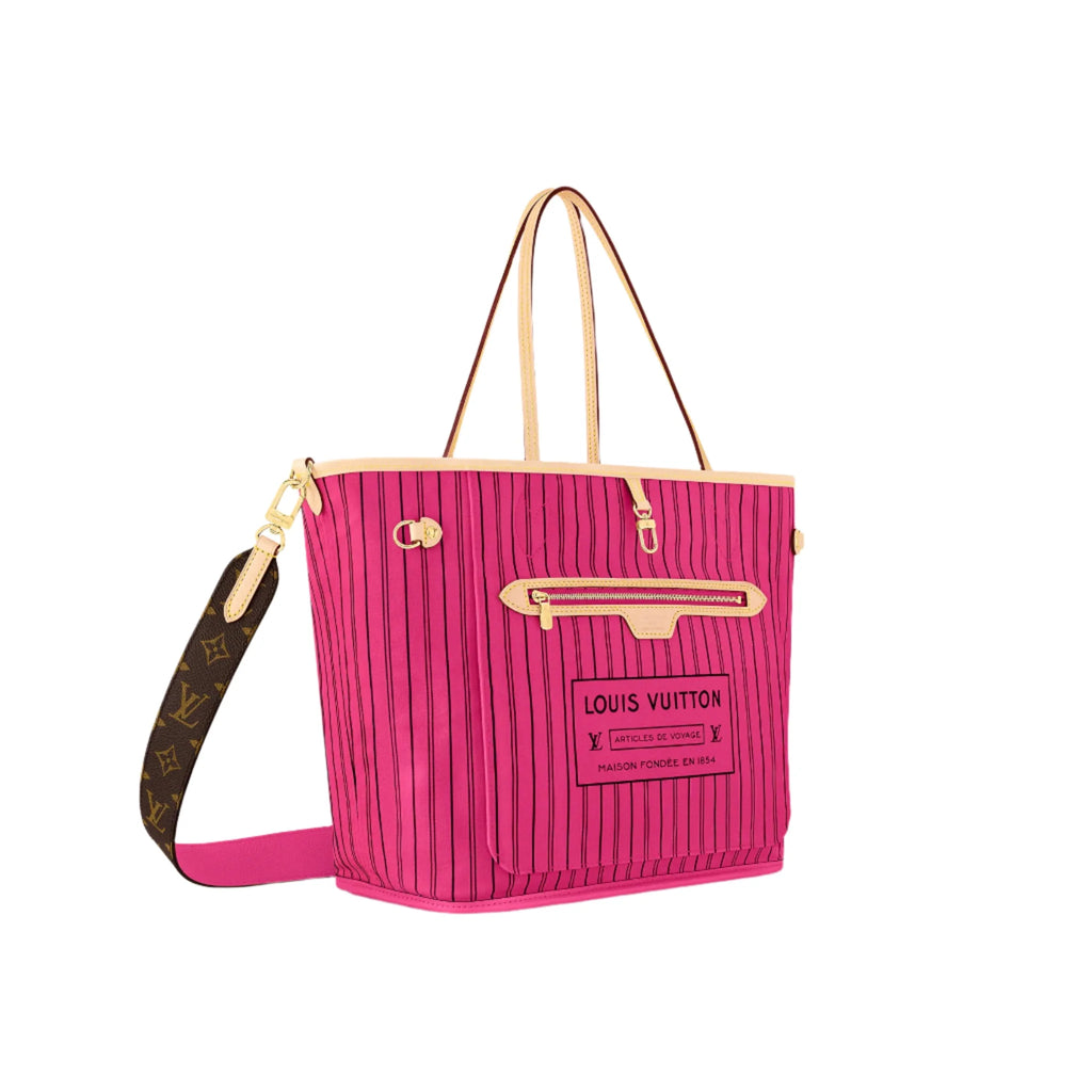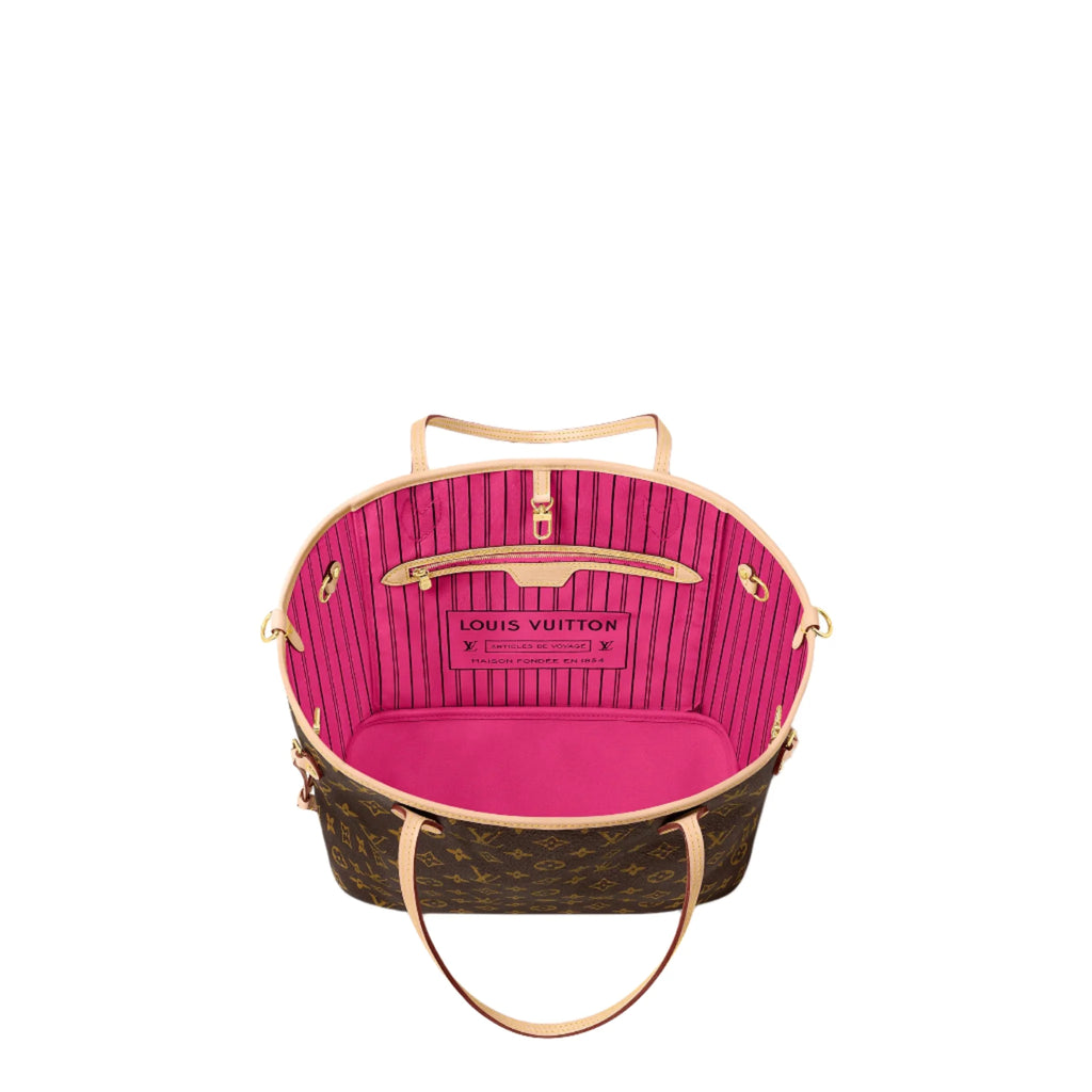 This Louis Vuitton Neverfull Bandoulière bag features a reversible design with the classic Monogram print on one side and a playful Rose Pondichery print on the other. The versatile size and adjustable straps make it perfect for everyday use, and the luxurious materials ensure durability and style.