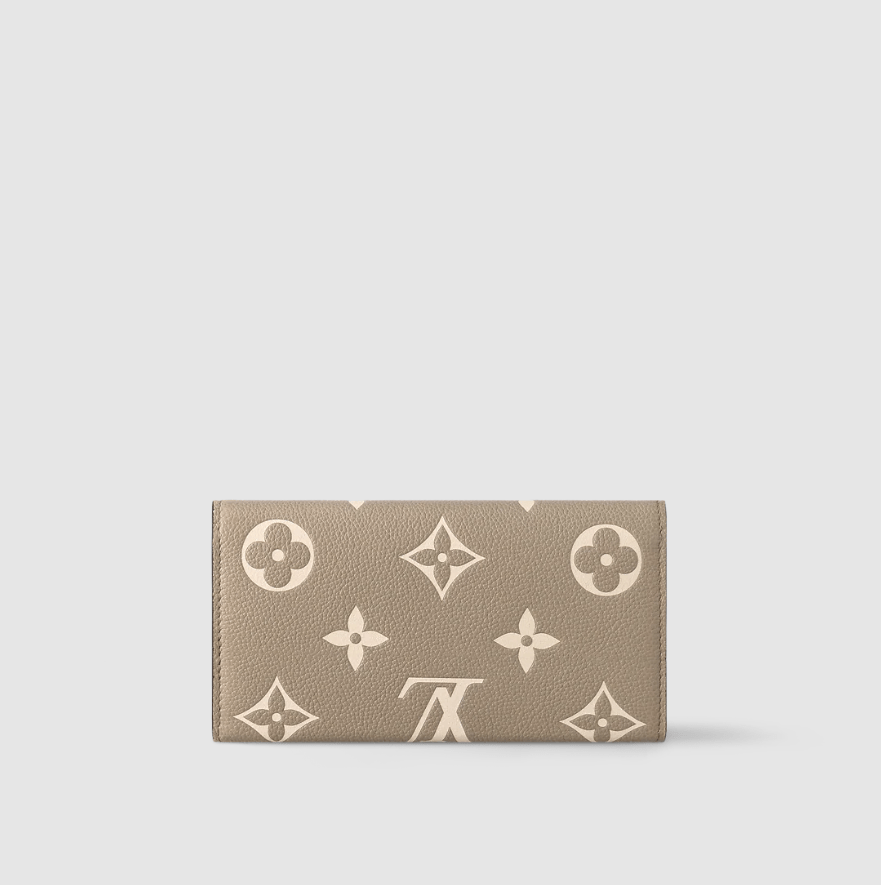 Louis Vuitton's classic Sarah wallet looks elegant in bicolor Monogram Empreinte leather, which is embossed with the signature Monogram pattern. The envelope-style flap, secured with a gold-tone press stud, opens to reveal a well-organized interior. In addition to two large compartments and several pockets, this wallet offers 16 card slots.