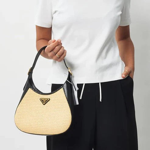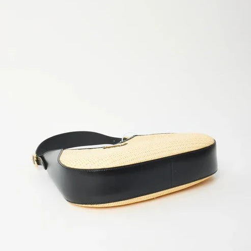 Expertly crafted by Prada, the Beige Raffia & Black Leather Small Cleo Bag combines luxury and durability. The raffia material adds a unique texture, while the leather provides a timeless elegance. Compact in size, yet spacious enough for all your essentials, this bag is perfect for daily use or special occasions