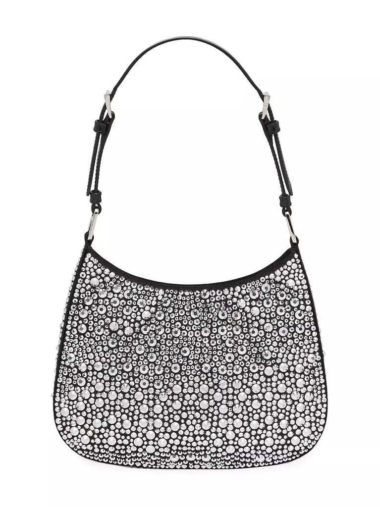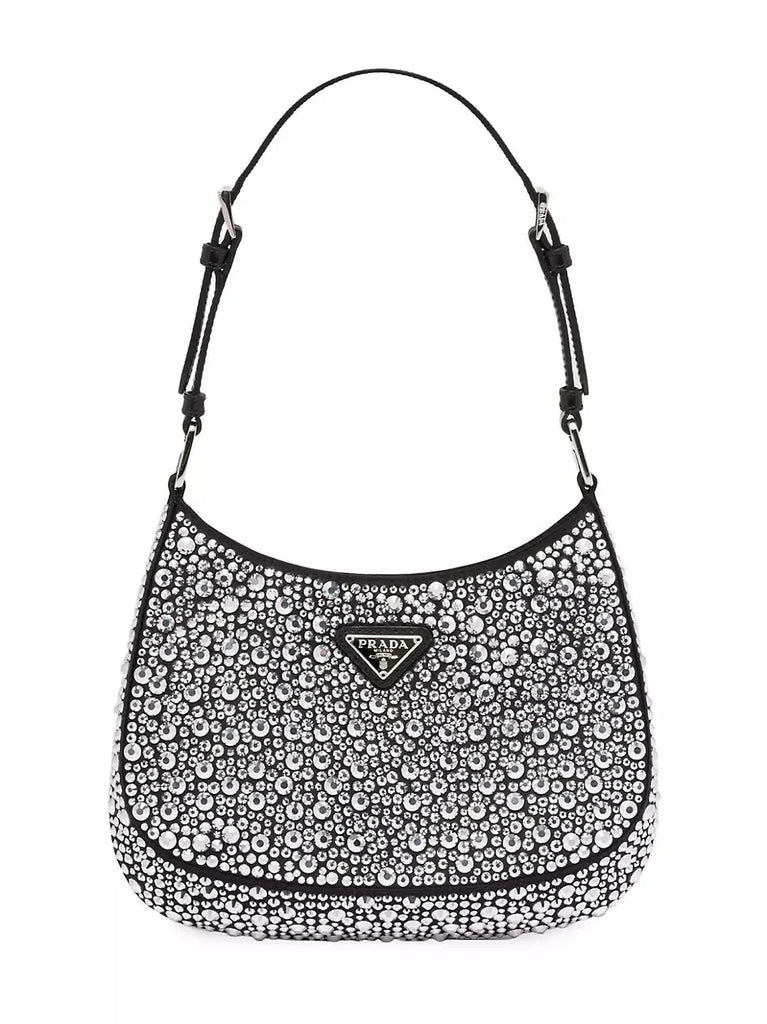 Feminine, elegant and modern, the Prada Cleo bag is made of satin and embellished with luminous crystals of different sizes that give the bag refined charm. The sinuous shape that recalls archive styles makes the accessory iconic.