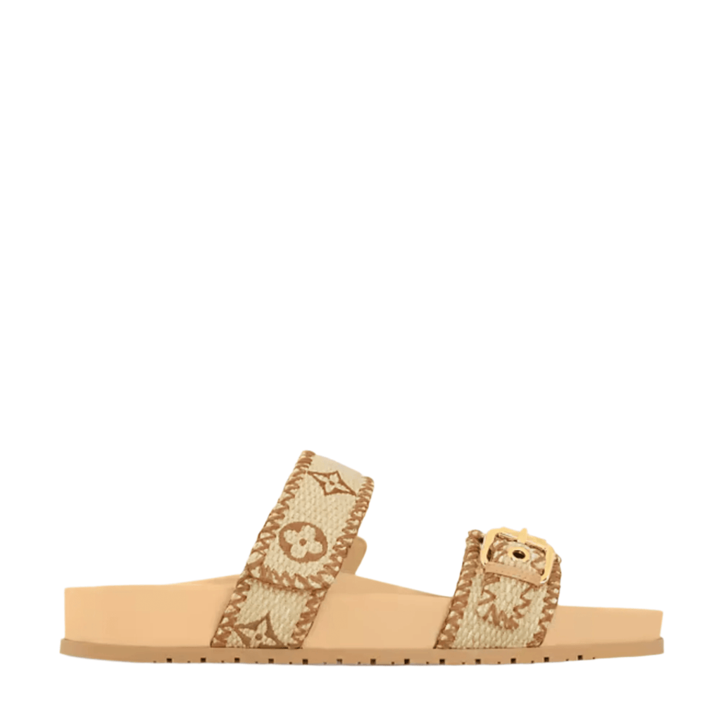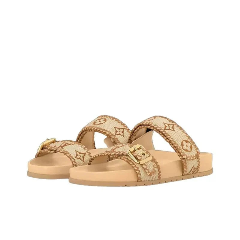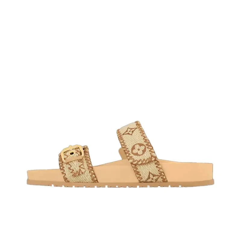 Elevate your daily routine with the LOUIS VUITTON Bom Dia Slide Slippers for women. Crafted with luxurious brown leather, these slides feature the iconic brand's name and monogram on the straps. Slip them on with ease and enjoy the comfort and elegance they bring to your outfit. Experience luxury at its finest with these timeless slippers.