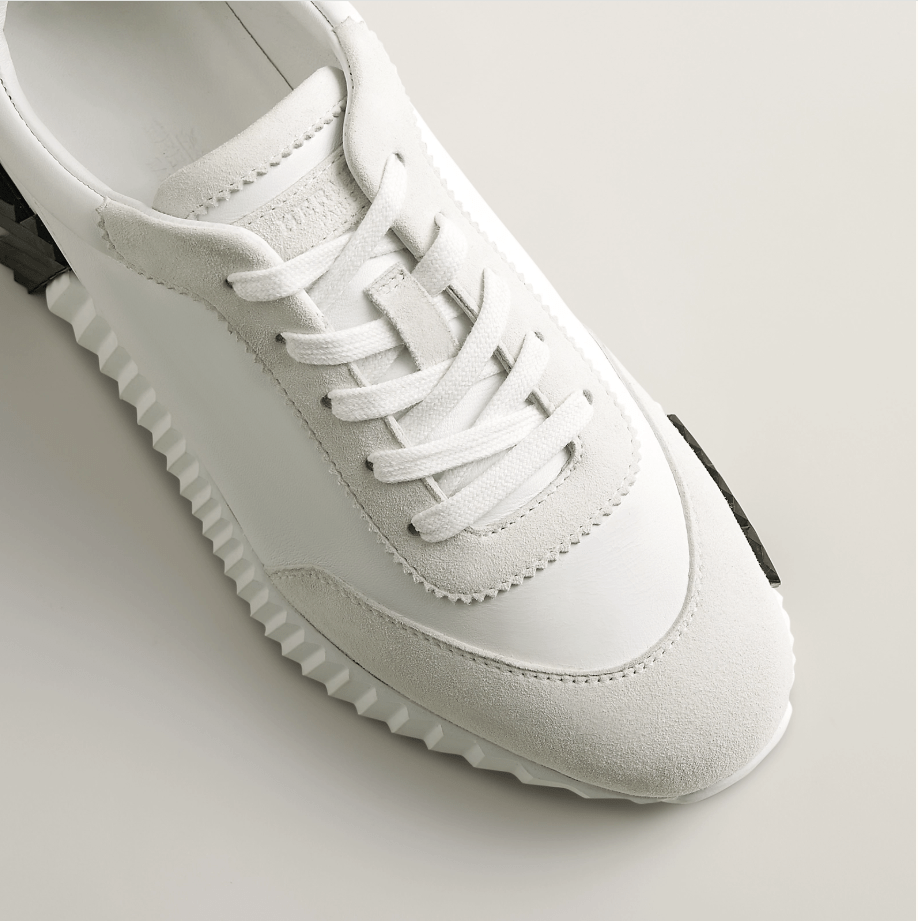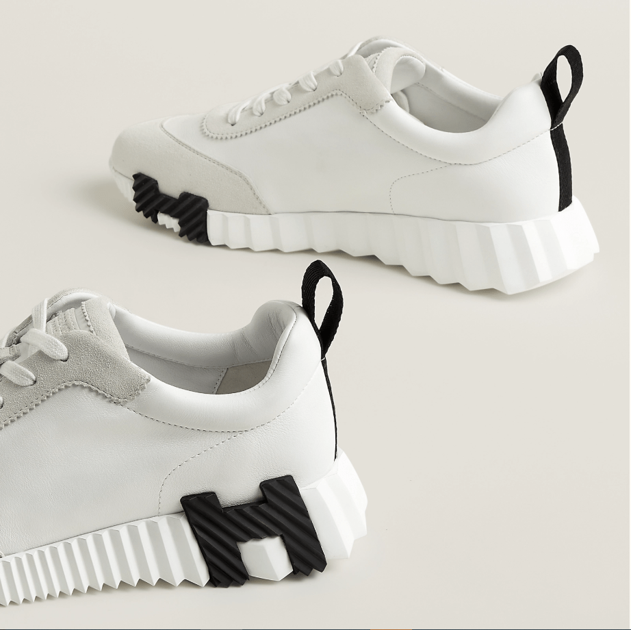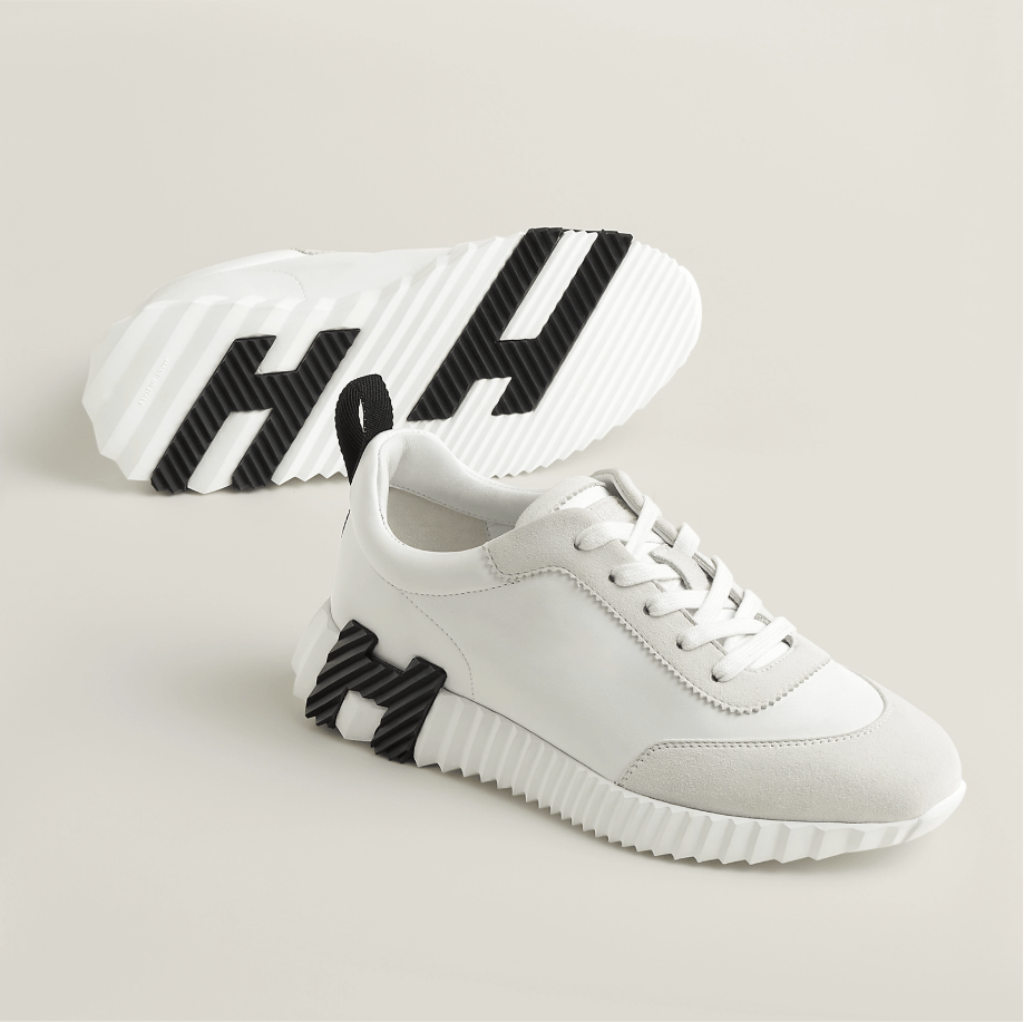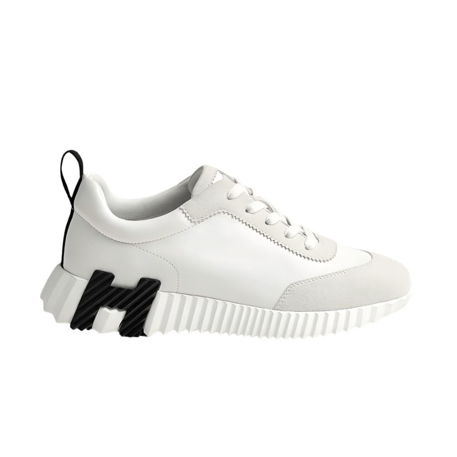 This Hermès Bouncing Blanc Sneaker combines luxury design with ultimate comfort. The elegant white leather exterior is carefully crafted by expert artisans, while the innovative bouncing technology in the sole provides a supportive and cushioned step. Look stylish and feel great with every stride.