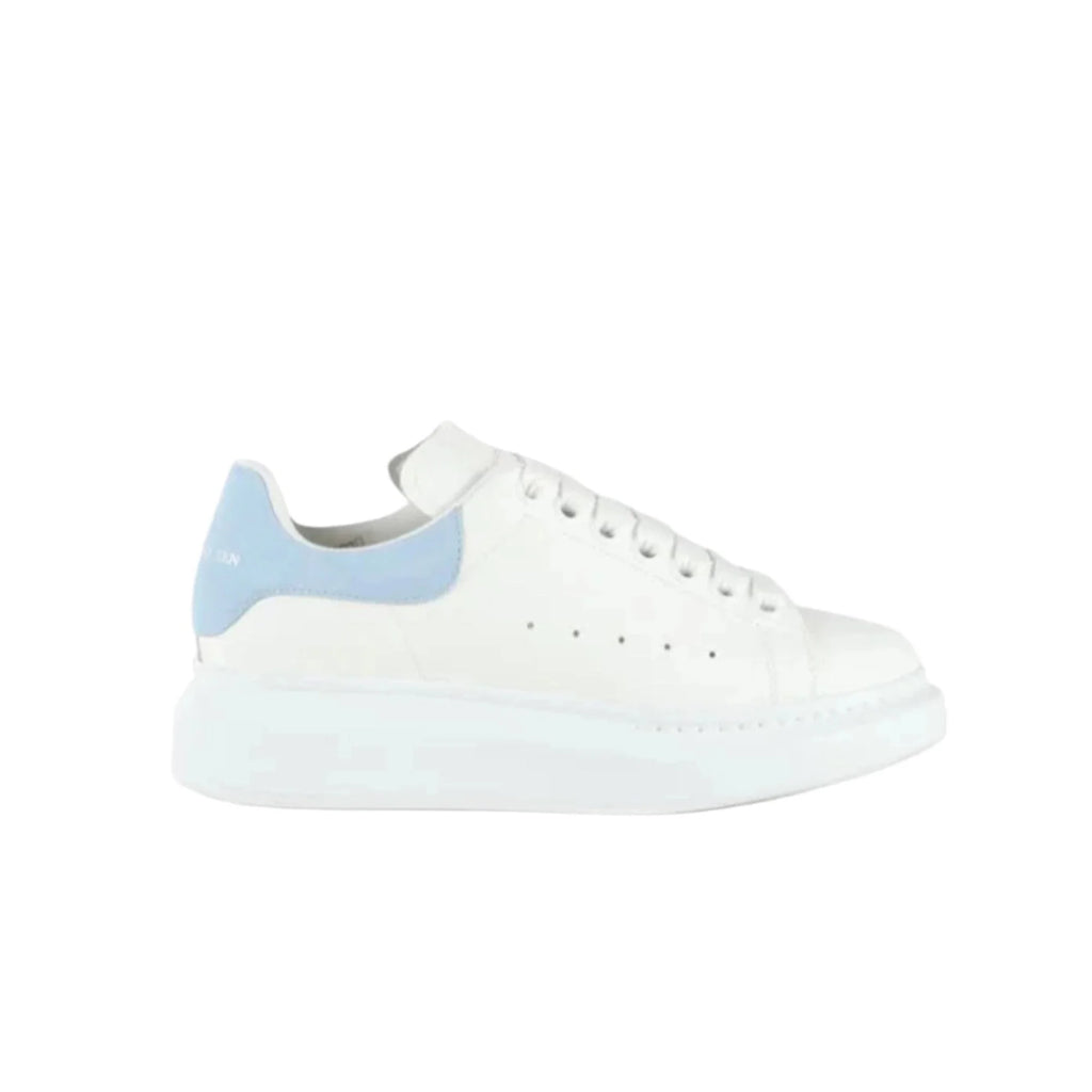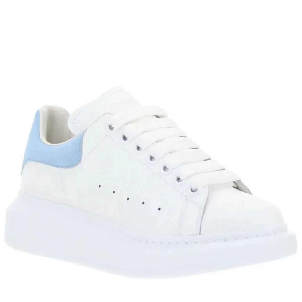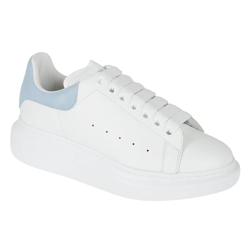 Low top sneakers in white calf leather. Rounded finger. White woven lace-up closure. Silver logo stamp on the padded tongue. Padded collar. Perforated details on the sides. Embossed logo on the heel in blue suede. Tonal rubber platform sole.