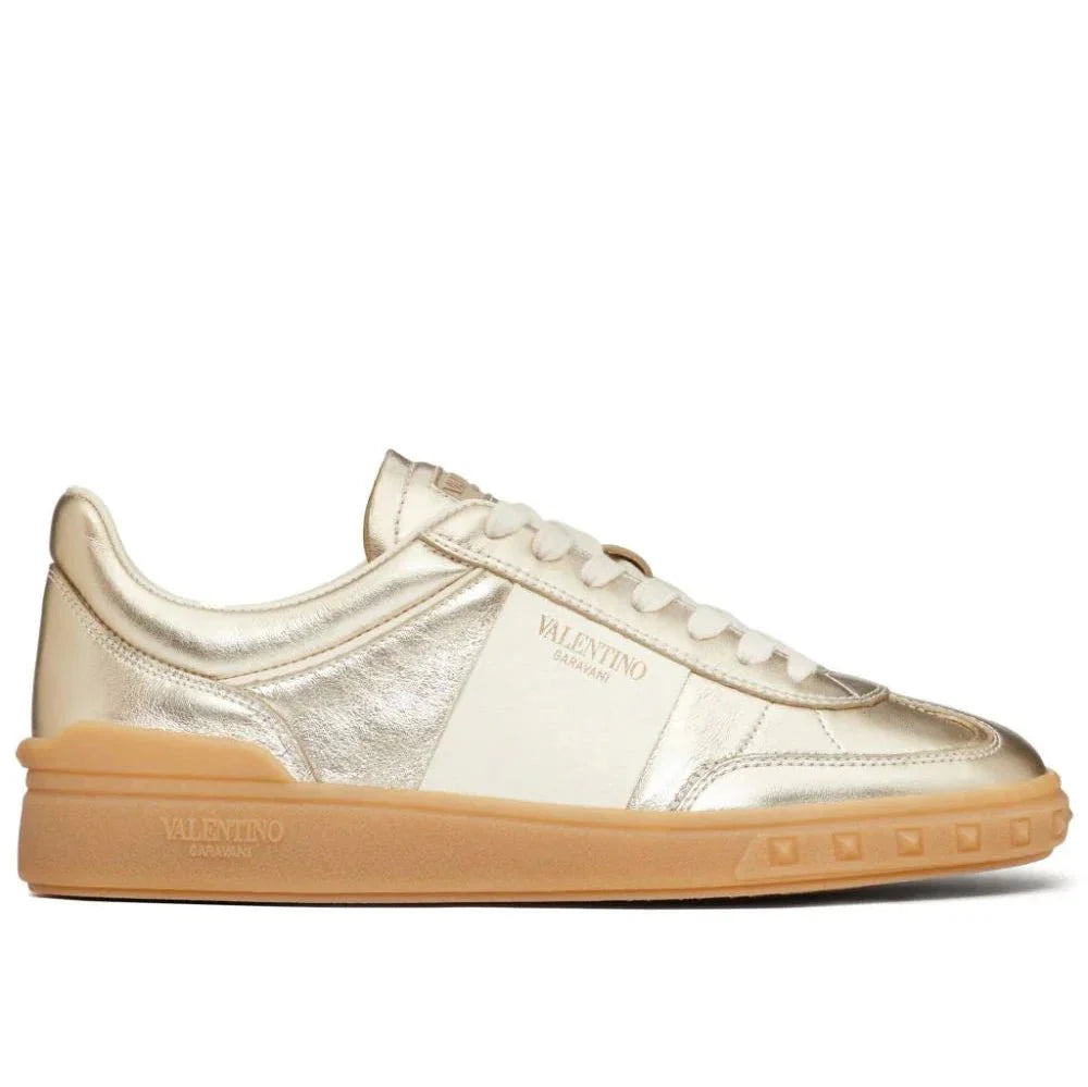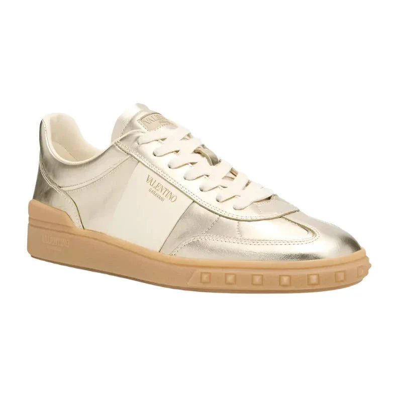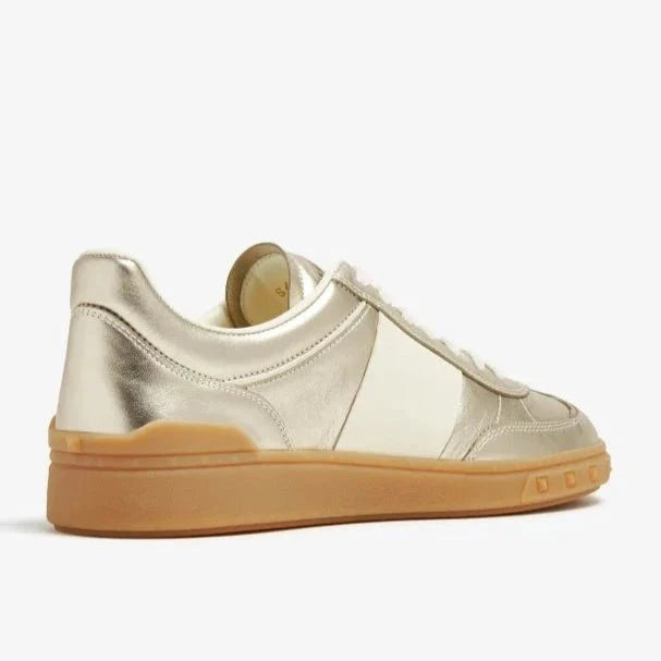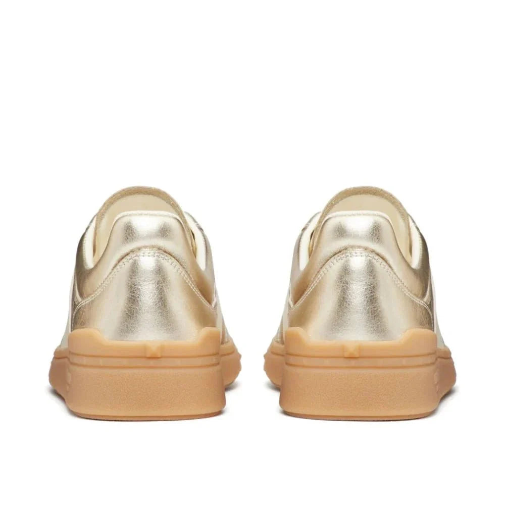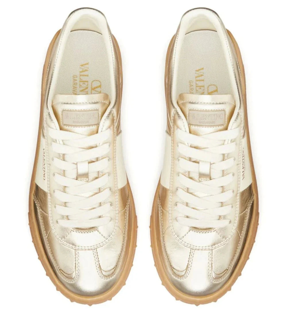 This product features a laminated finish in gold-tone calf leather, with a logo print on the side and a logo patch at the tongue. Its panelled design and round toe provide a modern and stylish look, while the front lace-up fastening ensures a secure fit. The contrasting rubber sole adds a touch of contrast to the overall design.