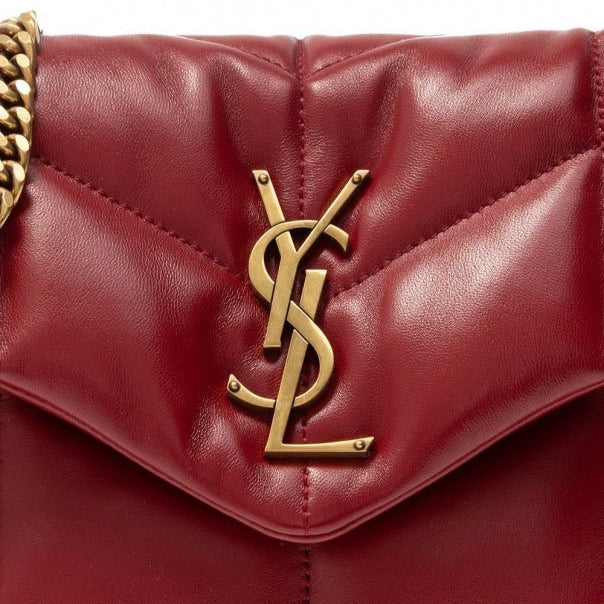 Saint Laurent red "Puffer" quilted shoulder bag. . Made of lambskin leather, this design fastens via a snap button and uses antique gold-tone hardware, including the initials YSL, a double chain-reinforced shoulder strap, and an interior with one pocket and one zip pocket.